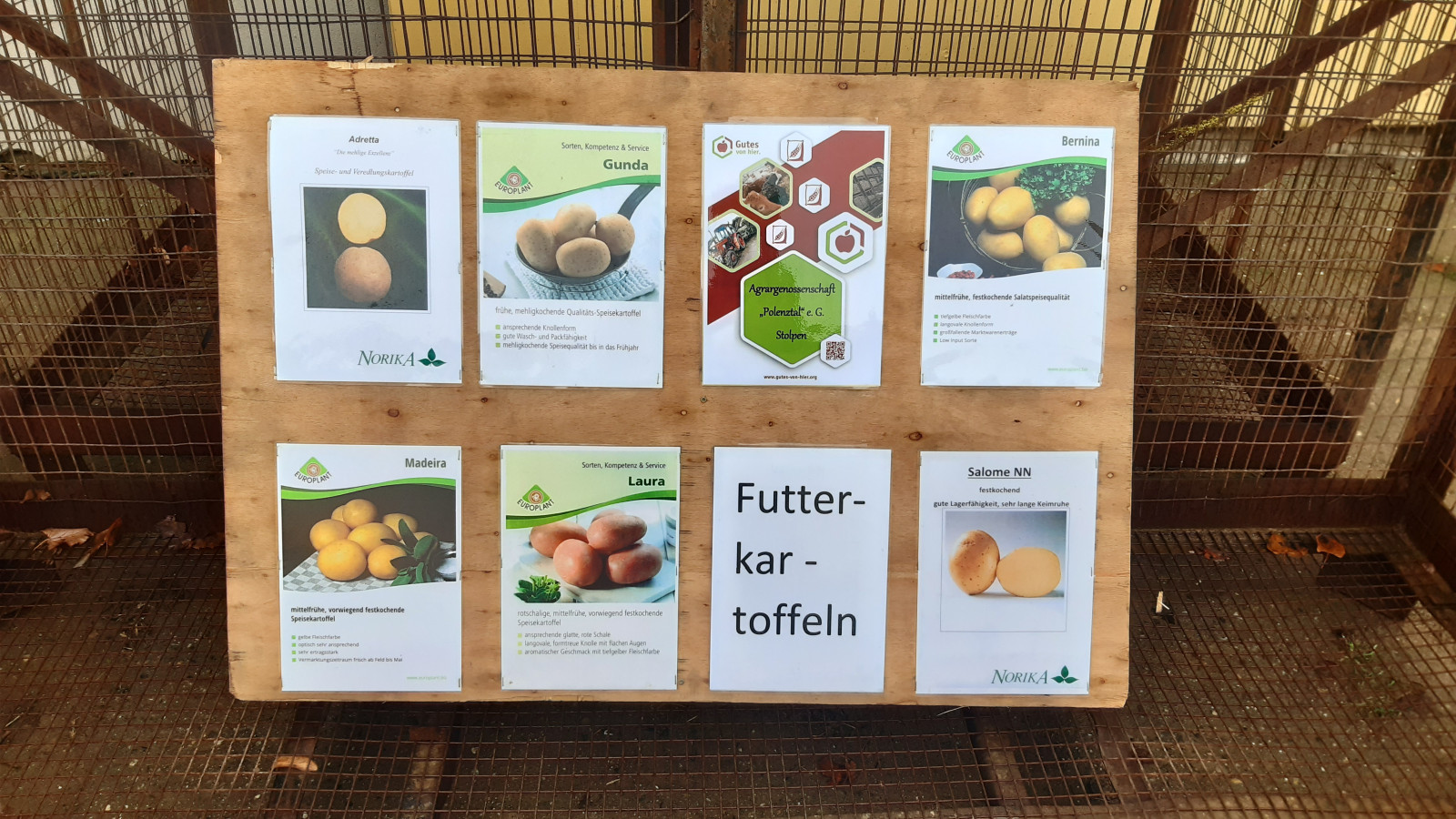 Fünf „handverlesene“ Sorten Speisekartoffeln stehen dieses Jahr im Feld. Der „Liebling“ sowohl der privaten Haushalte als auch der Gastronomen ist ohne Zweifel „LAURA“, ein rotschaliges, tief gelbfleischiges und schmackhaftes Universalgenie. Eine frühe, schon ab August zu erntende, schmackhafte Kartoffel ist „FINKA“, für Freunde der mehligen Zunft gibt es „LUCILLA“. Abgerundet wird das Sortiment in diesem Jahr durch zwei neue Sorten mit den wohlklingenden Namen „MADEIRA“ und „JULINKA“. Die geschmacklich und qualitativ bessere von beiden soll im nächsten Jahr zum „Stammquartett“ gehören.