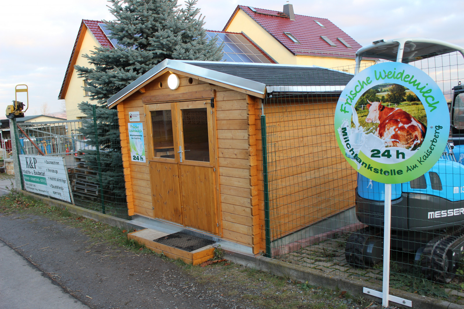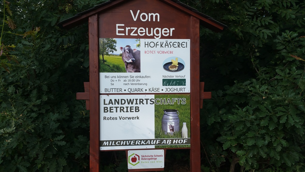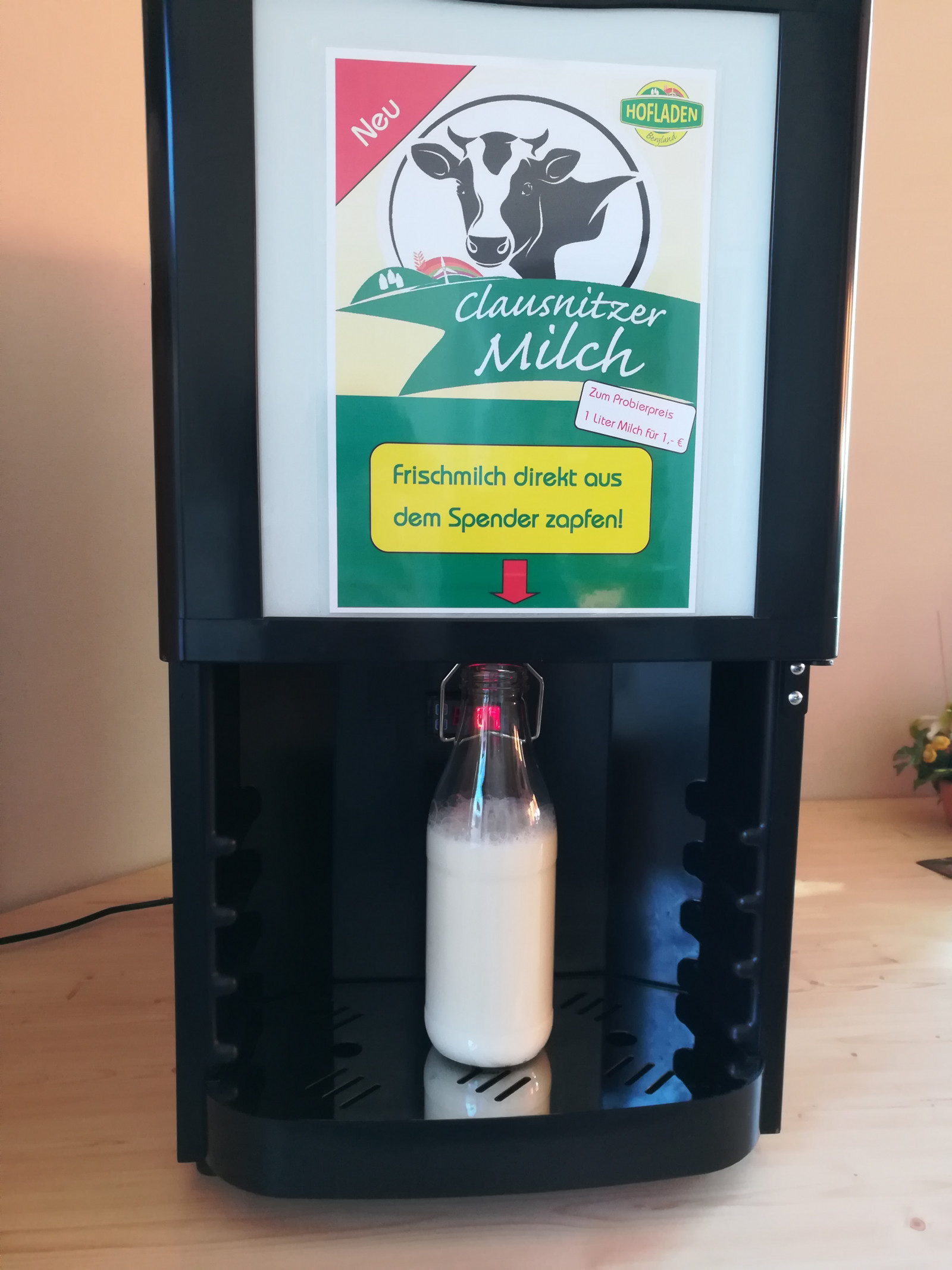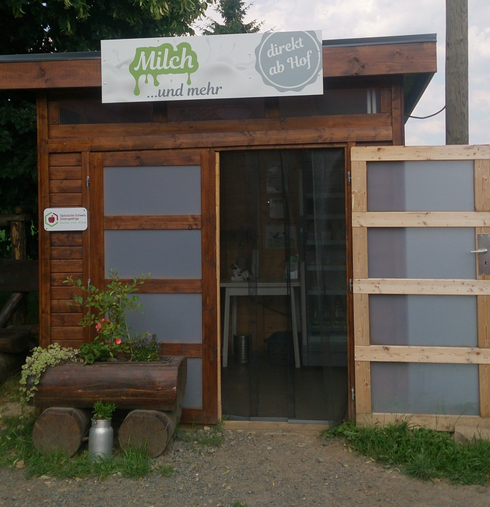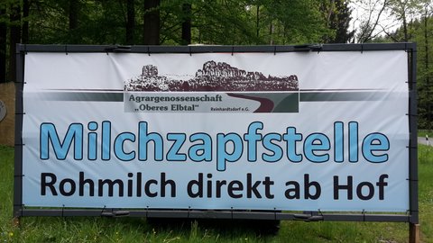 Seit Pfingsten 2016 gibt es die Reinhardtsdorfer „Milchzapfstelle“, an der Milchfreunde aus nah und fern rund um die Uhr 365 Tage im Jahr täglich frisch gemolkene, naturbelassene Rohmilch in mitgebrachte oder bereitstehende Gefäße abfüllen können. Der Liter kostet 1 Euro. eine neue, leere Glasflasche kann man für 50 Cent erwerben und gern auch immer wieder benutzen. 100 -150 Liter Rohmilch gehen derzeit täglich „über den Zapfhahn“, rein rechnerisch arbeiten demnach 3-5 der 500 Kühe der Agrargenossenschaft für die Direktvermarktung.